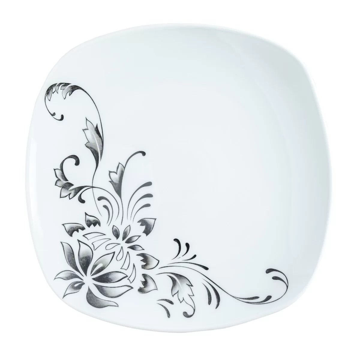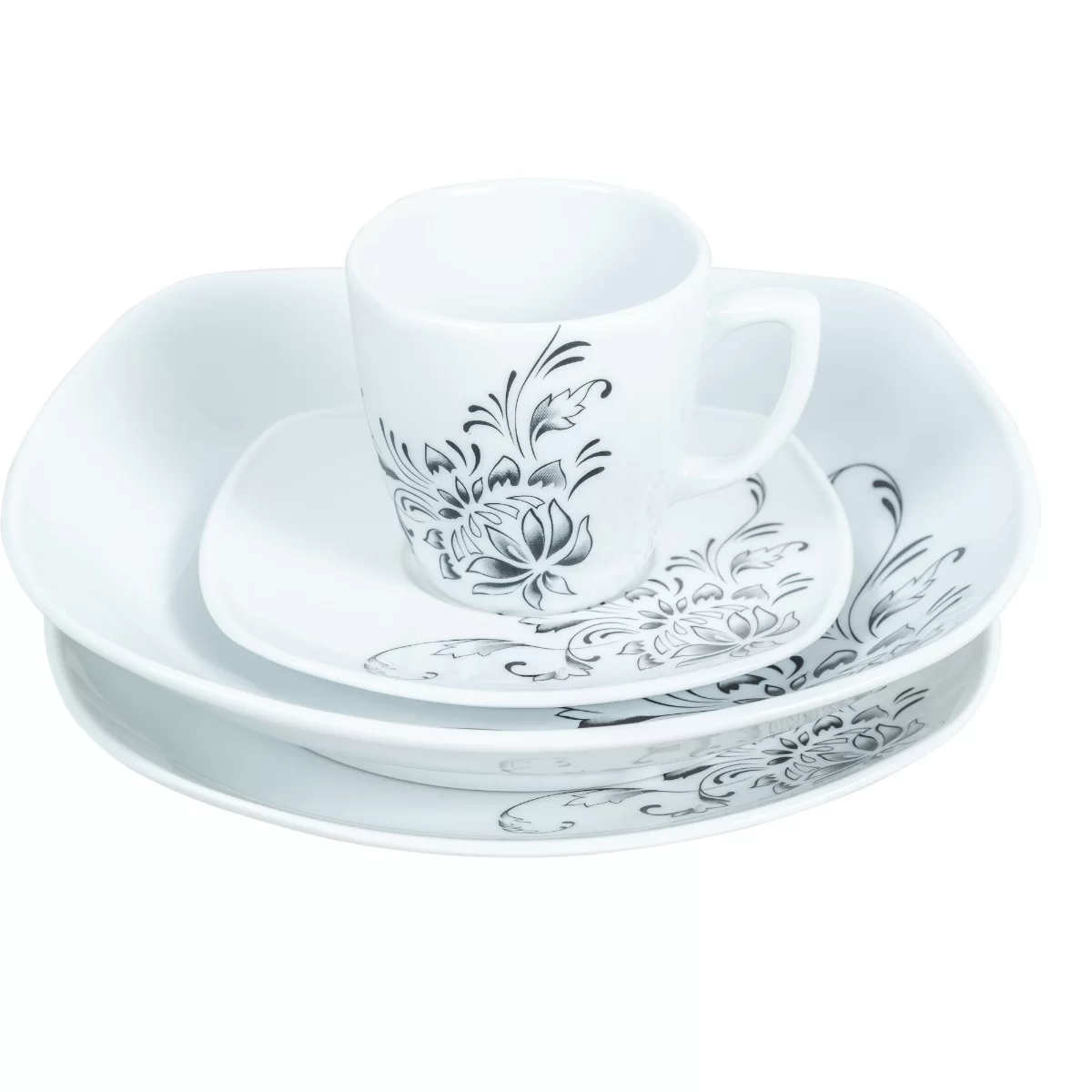 The porcelain dinner set includes: - 6 desert plates diameter 19.5 cm - 6 soup plates diameter 23.5 cm - 6 dinner plates diameter 25.5 cm and 450 ml - one soup bowl diameter 25.5 cm, volume 2100 ml - one tray of 30.5 x 20 x 3.5 cm