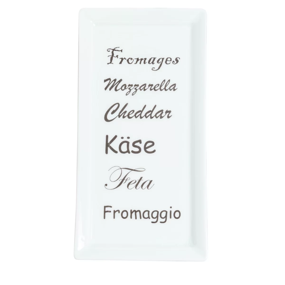 Porcelain tray with the message FROMAGES, MOZZARELLA suitable to serve types of chesse or other foods. Dimmensions: 26 * 13 cm.