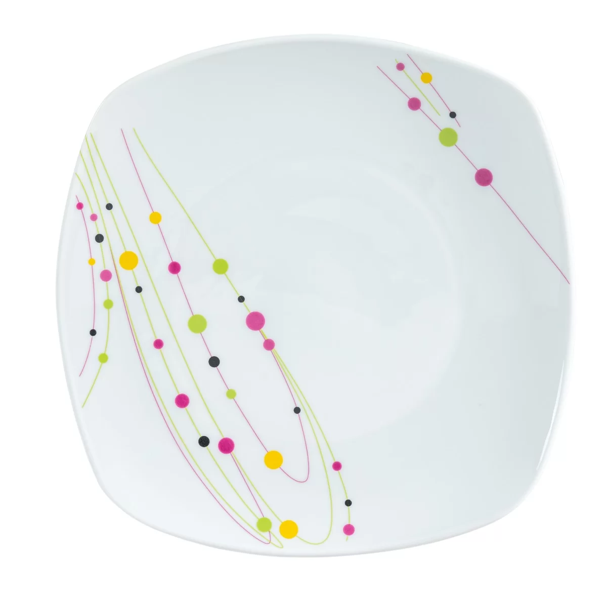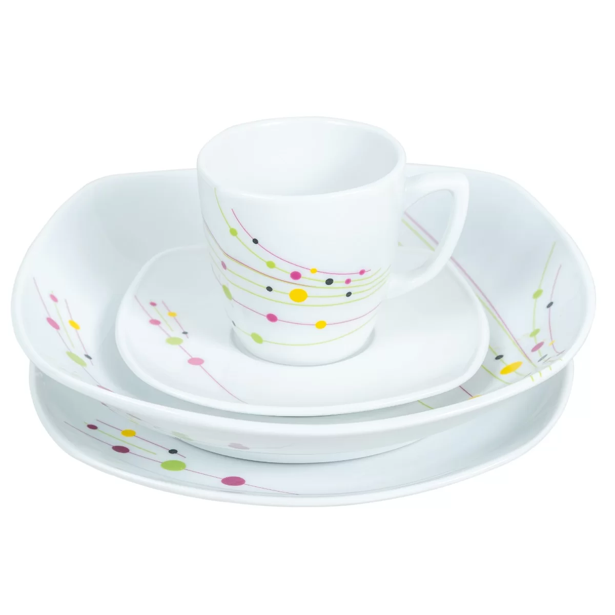 The porcelain dinner set includes: - 6 desert plates diameter 19.5 cm - 6 soup plates diameter 23.5 cm - 6 dinner plates diameter 25.5 cm and 450 ml - one soup bowl diameter 25.5 cm, volume 2100 ml - one tray of 30.5 x 20 x 3.5 cm