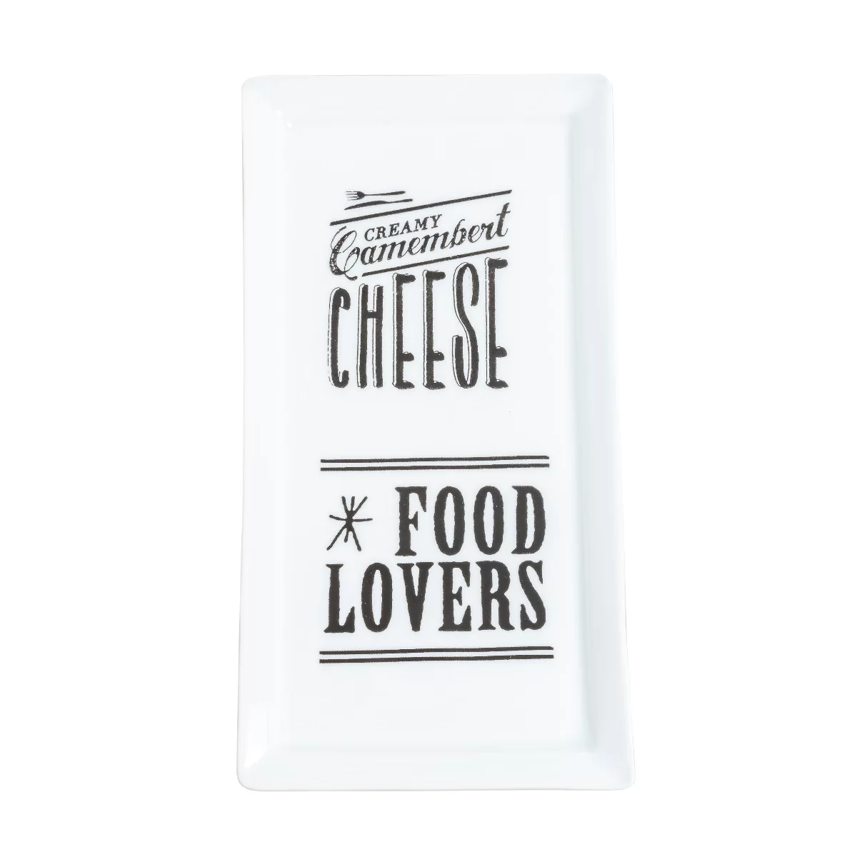 Porcelain tray with the message FOOD LOVERS suitable to serve types of chesse or other foods. Dimmensions: 26 * 13 cm.
