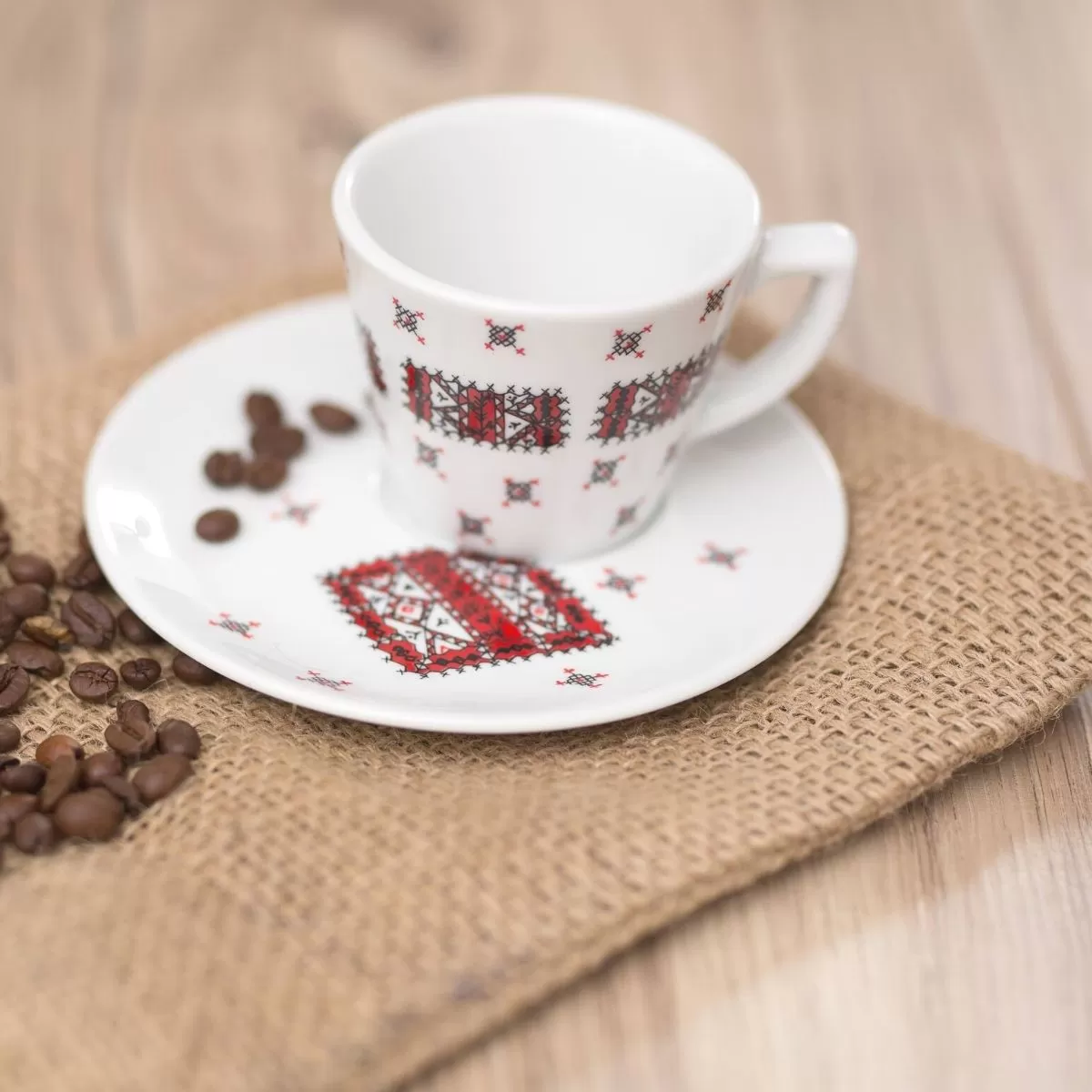Cappuccino cup and saucer with decoration HORA. Inspired by Romanian culture and traditons, the HORA Collection was created together with designer Alina Alecu from Porphyras. The cup and saucer can be bought together with the rest of the products in the HORA collection. The cup has a volume of 180 ml and the place of the cup on the saucer is on the side allowing you to place the sugar and coffee spon.