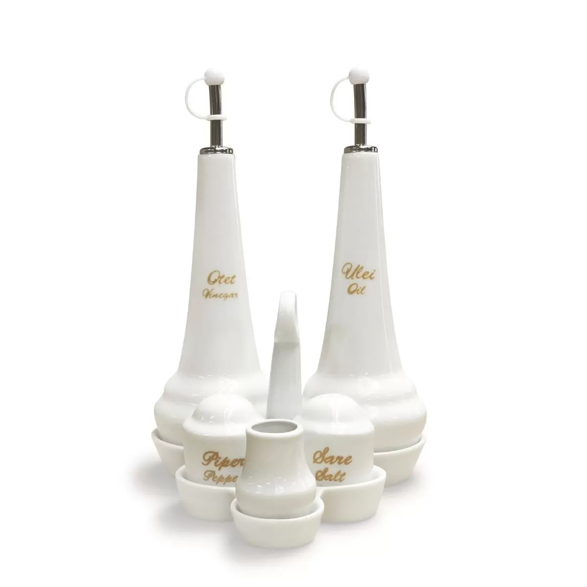 The most elegant porcelain olivier set ! The olivier set includes 6 pieces: salt and pepper shakers, oil and vuinegar bottle, toothpick holder and one tray to support all items. The trays has individual spots for all products in the set.