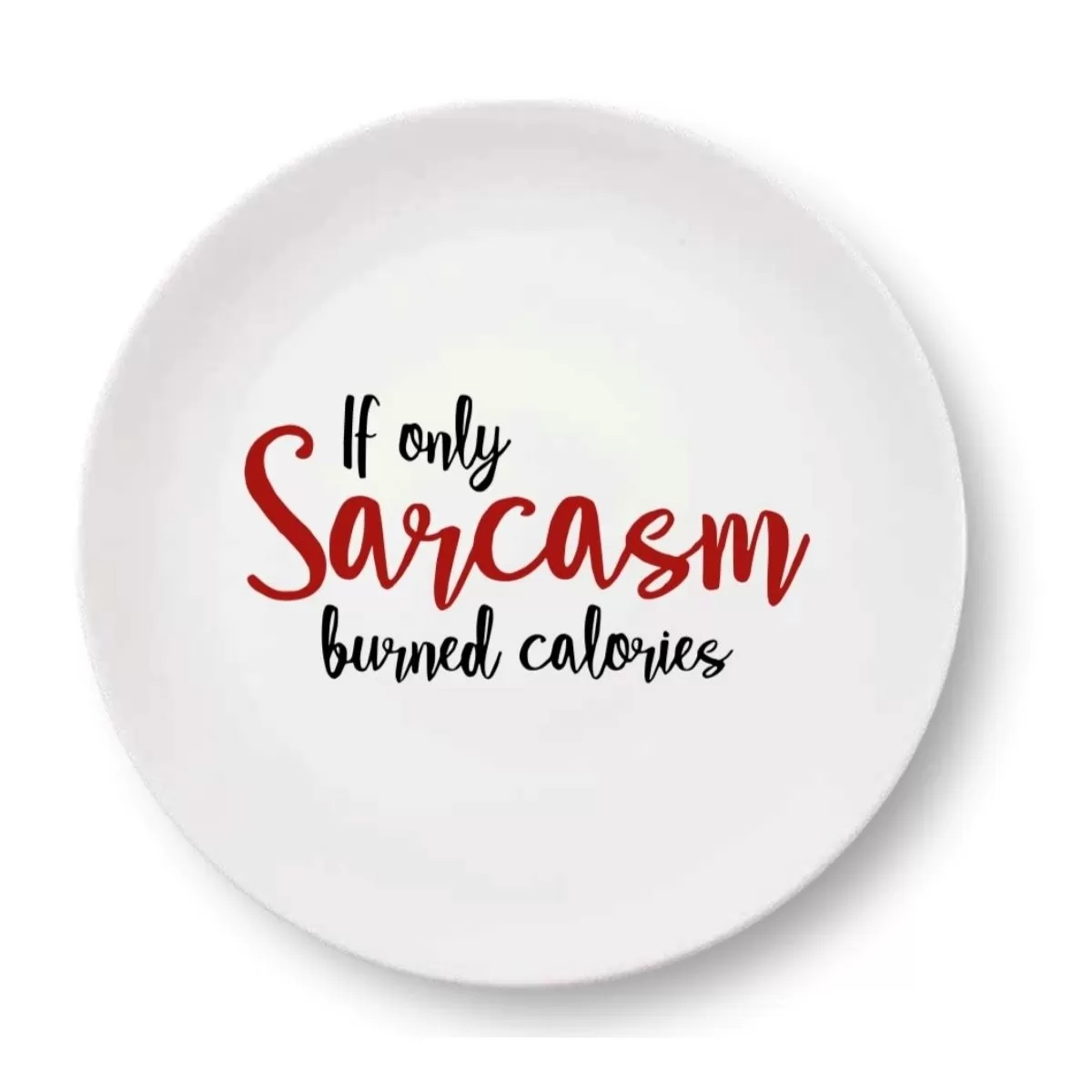 Farfurie din portelan de diametru 23,5 cm cu mesajul "If only SARCASM burned calories". Cauti un cadou util, dar putin altfel? Sau poate doar vrei ca masa ta din fiecare zi sa fie …altfel. Cu aceasta farfurie ai reusit! Prietenii te vor invidia.