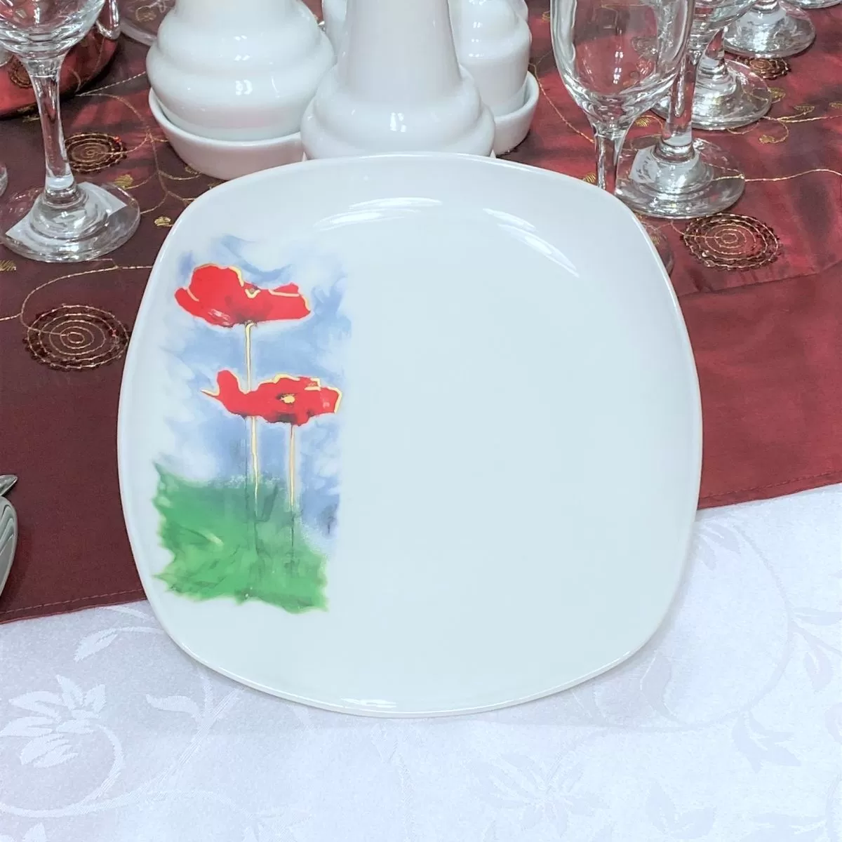 Farfurie desert din portelan decorata cu MAC. Dimensiunea farfuriei 19,5 cm.