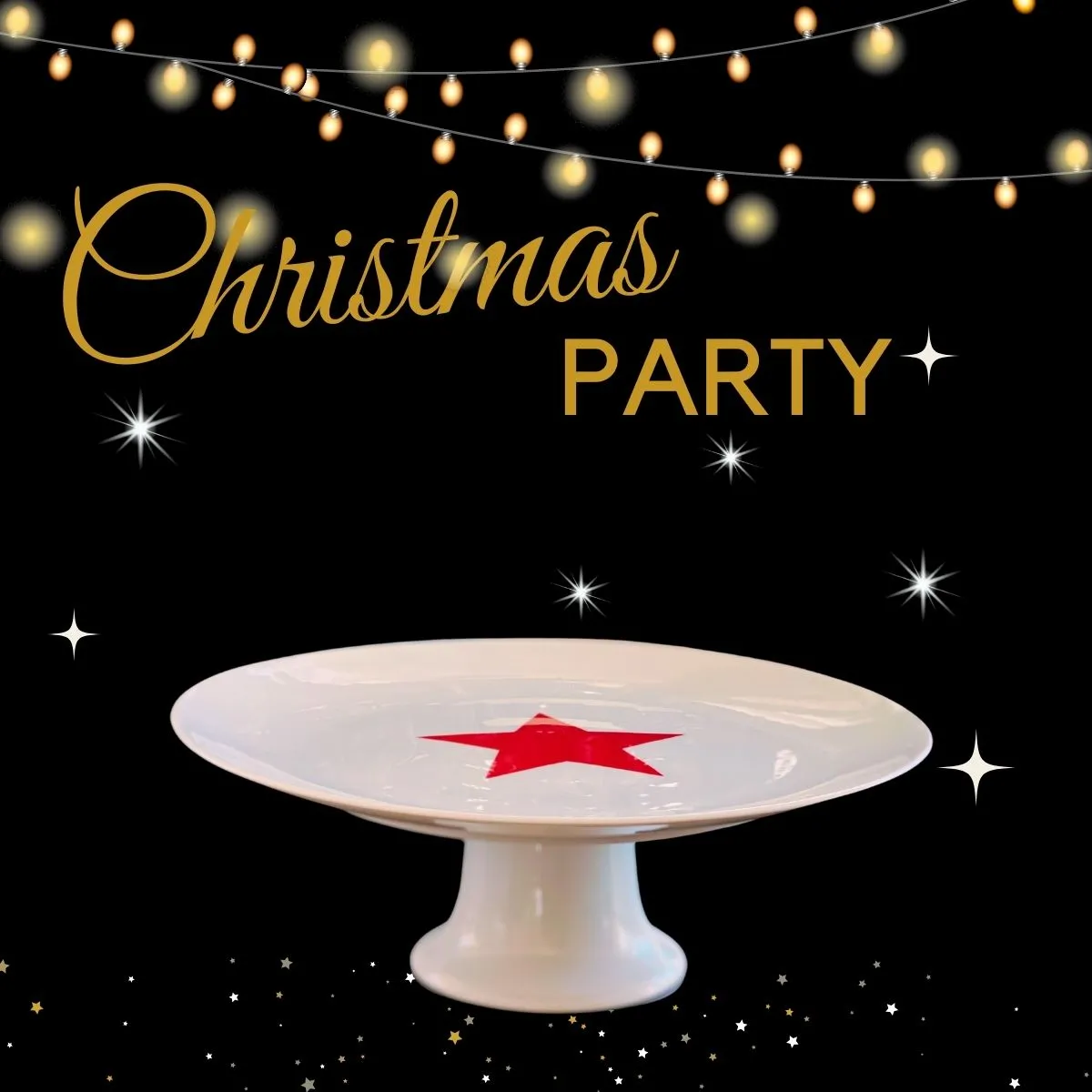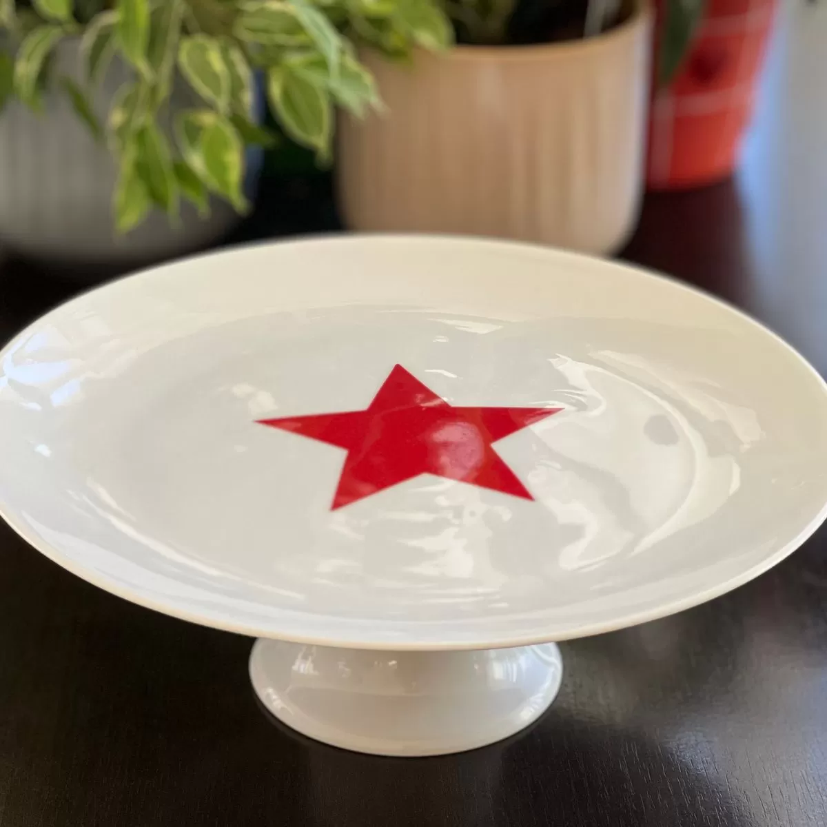 Suportul din portelan este cu picior pentru a constitui piese centrala pe masa de sarbatori. Platoul este personalizat cu stea rosie de Craciun.