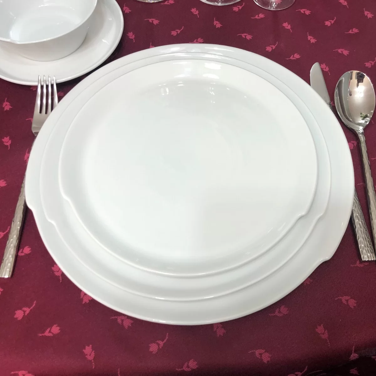 Serviciul de masa din portelan gama Viena contine: - 6 farfurii desert cu diametrul de 22,5 cm - 6 farfurii adanci cu diametrul de 21 cm si 550 ml - 6 farfurii intinse cu diametrul de 25,5 cm