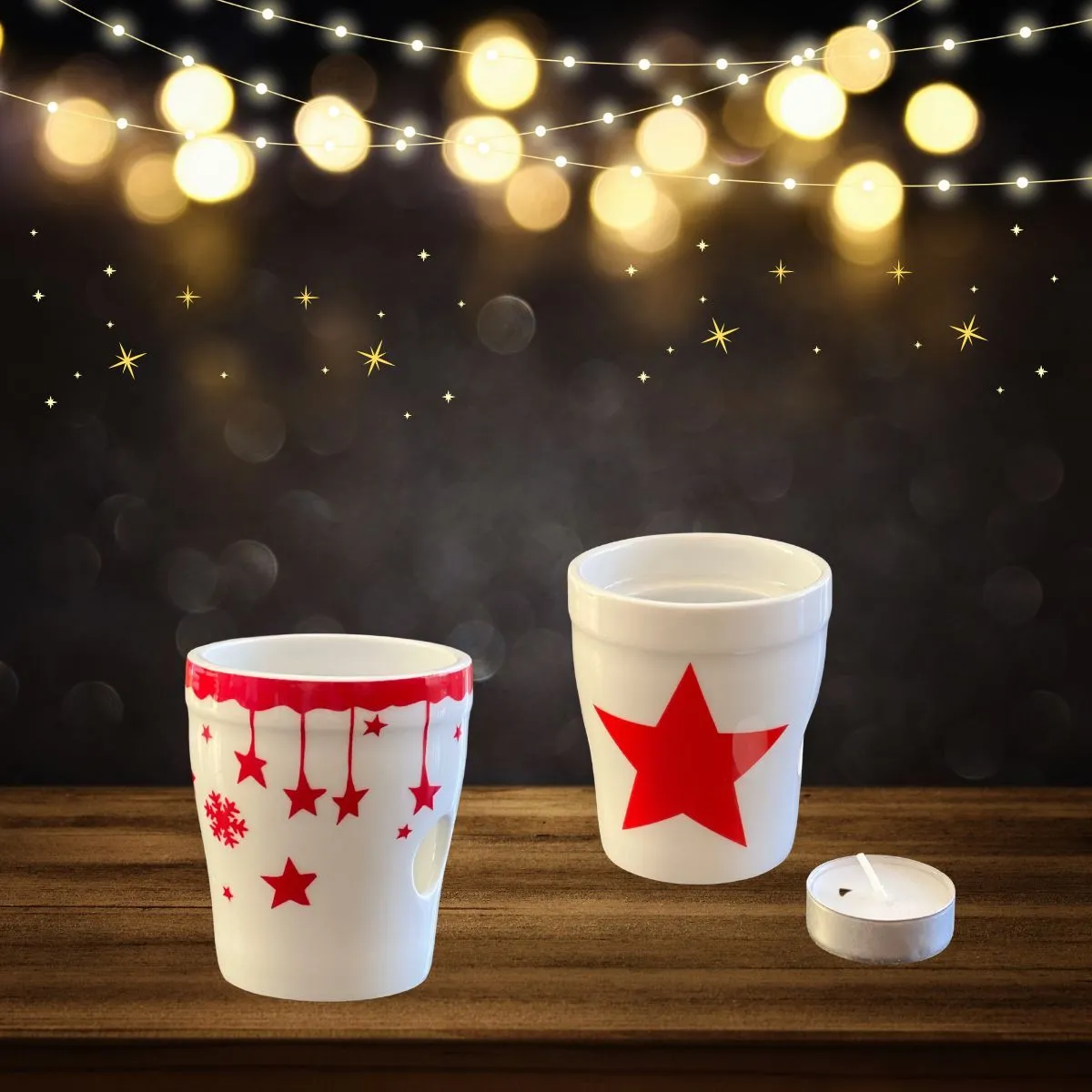 Alege Cadoul Perfect: Suporți Lumânări cu Ghirlandă de Steluțe Roșii și Stea de Crăciun !