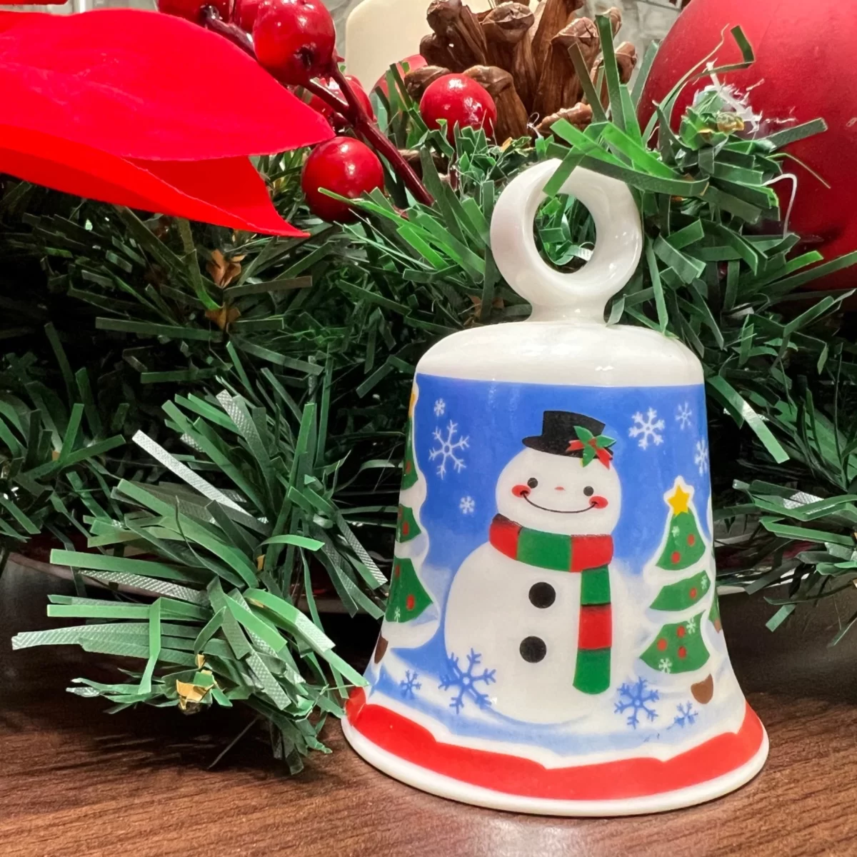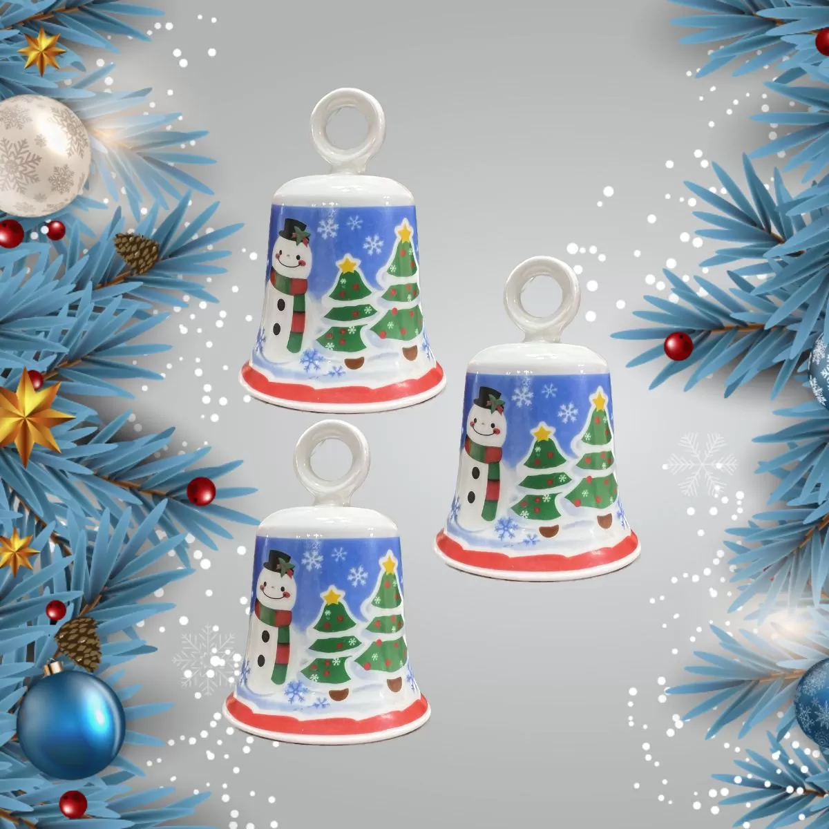Set 3 clopotei de Crăciun cu design specific: om de zapada si brazi impodobiti cu zapada.