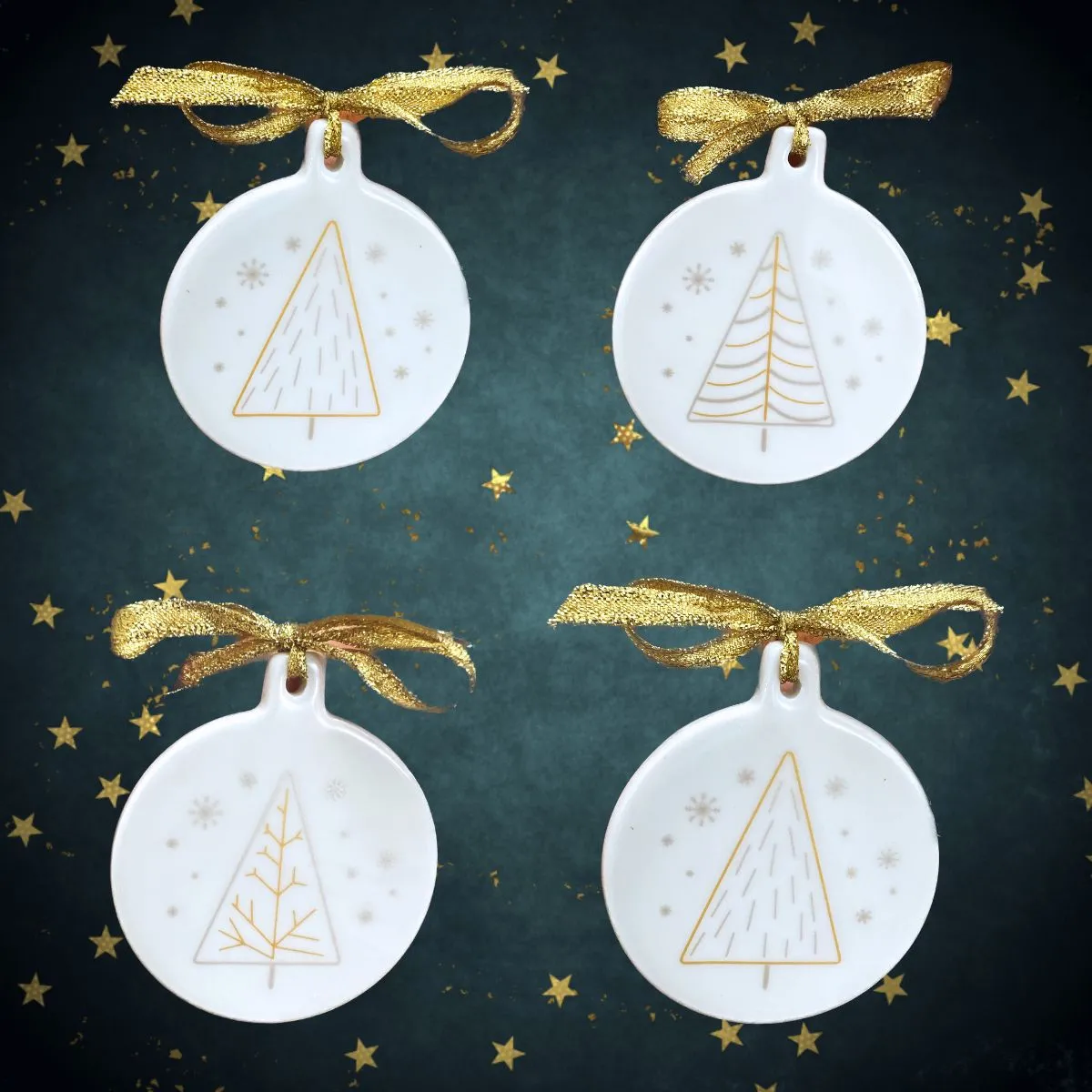 Set 4 ornamente glob de Crăciun cu design-uri diferite realizate în culorile auriu și argintiu. Realizate din porțelan de buna calitate, sunt decorate cu model pe fata lucioasa și albe pe spate.