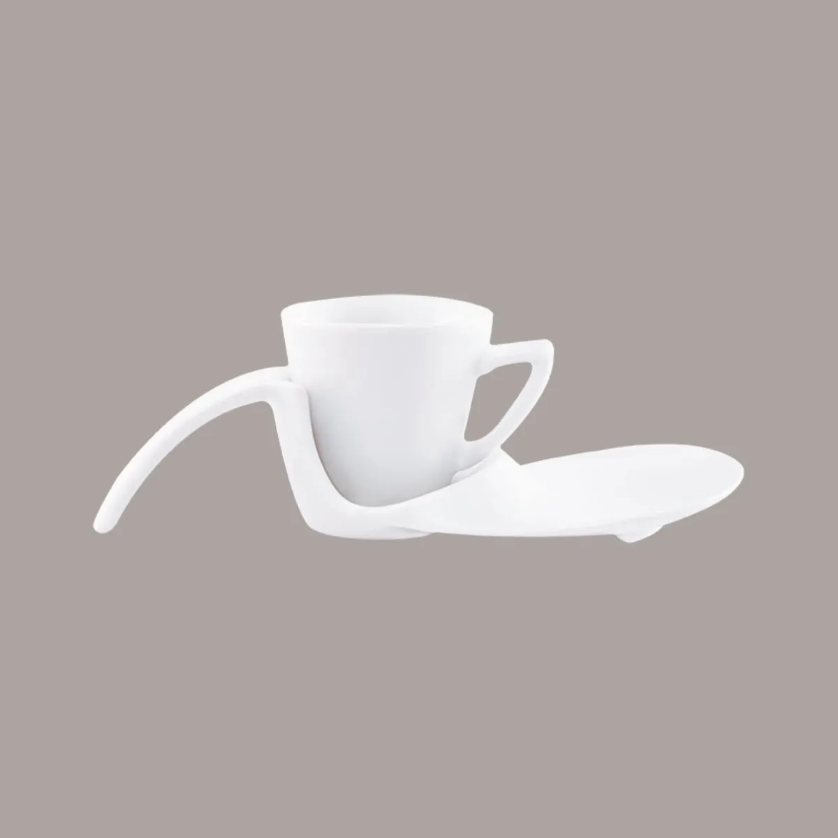 Ceașca de espresso, cu un design modern și ergonomic, se potrivește perfect în mână, oferind o experiență plăcută la atingere. Farfuria, pe lângă rolul său tradițional, se remarcă prin două elemente distinctive: